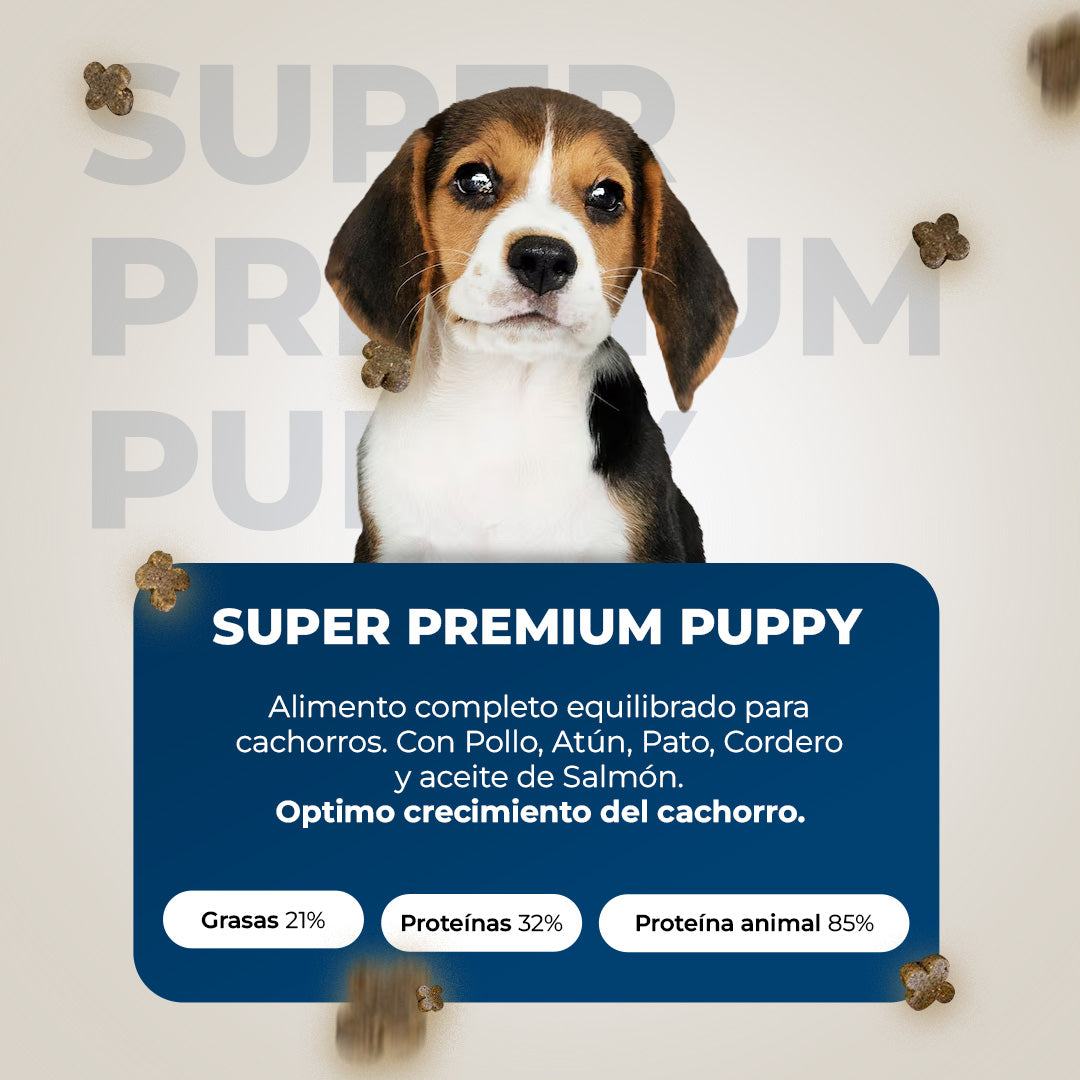 Alimento completo equilibrado para cachorros. Con Pollo, Atún, Pato, Cordero y aceite de Salmón. Optimo crecimiento del cachorro.
