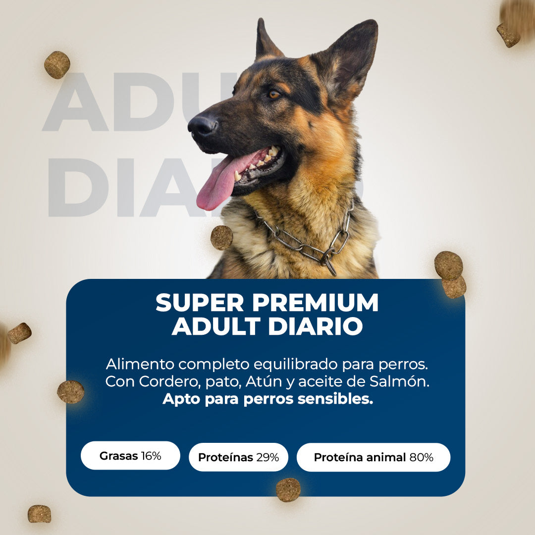 Alimento completo equilibrado para perros. Con Cordero, pato, Atún y aceite de Salmón.