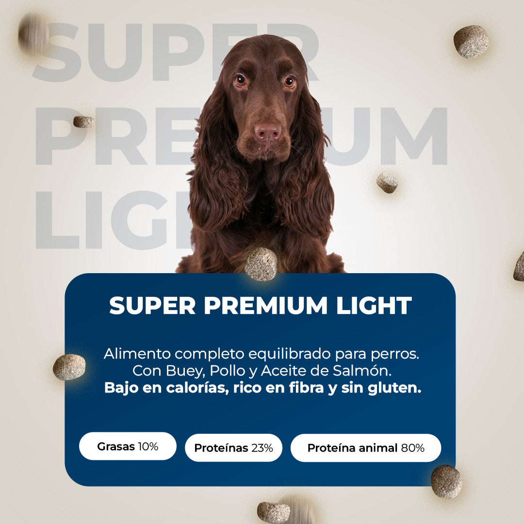 Alimento completo equilibrado para perros. Con Buey, Pollo y Aceite de Salmón. Bajo en calorías, rico en fibra y sin gluten.